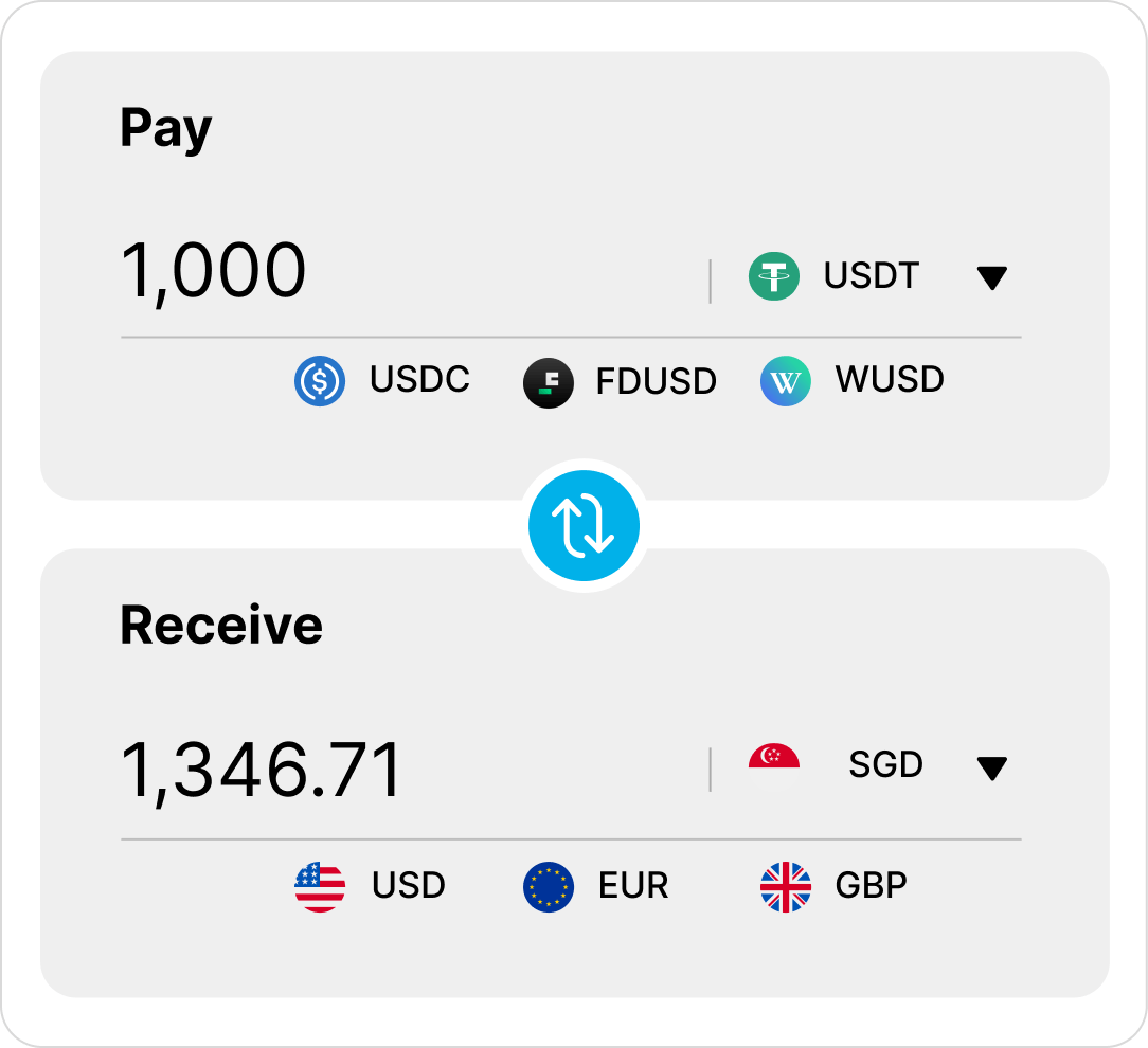 Whether you're using SGD, USD, GBP or EUR, we enable you to quickly receive payments in your preferred stablecoins without high processing fees.
